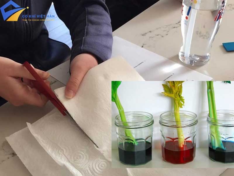 - Treo một đầu giấy thấm vào cốc nước màu