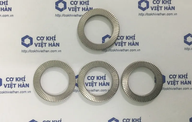 - Khi siết chặt đai ốc, các răng cưa ở mặt ngoài của vòng đệm cắn vào bề mặt của đai ốc và vật liệu nền, tạo ra ma sát cao.