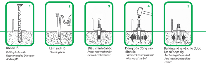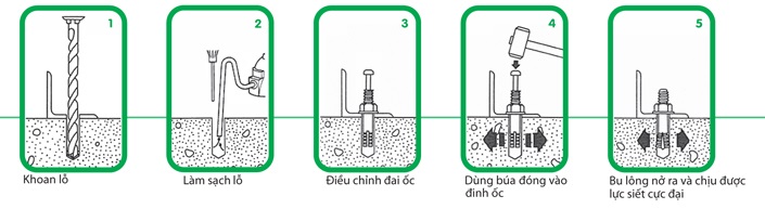 Việc thi công nở đinh Sanko inox được thi công qua 5 bước như bên dưới đây: