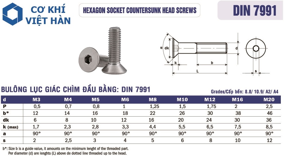 Hiện tại thì vít đĩa chìm inox được sản xuất theo tiêu chuẩn Đức Din 7991 là phổ thông nhất. Dưới đây là bảng thông số của vít đĩa chìm inox mà cơ khí Việt Hàn đang phân phối đến quý khách hàng.
